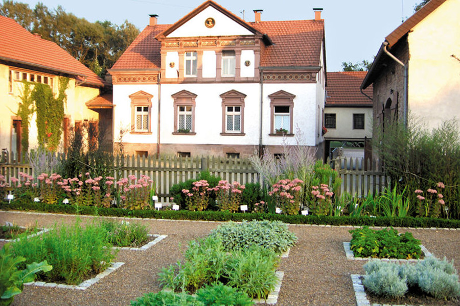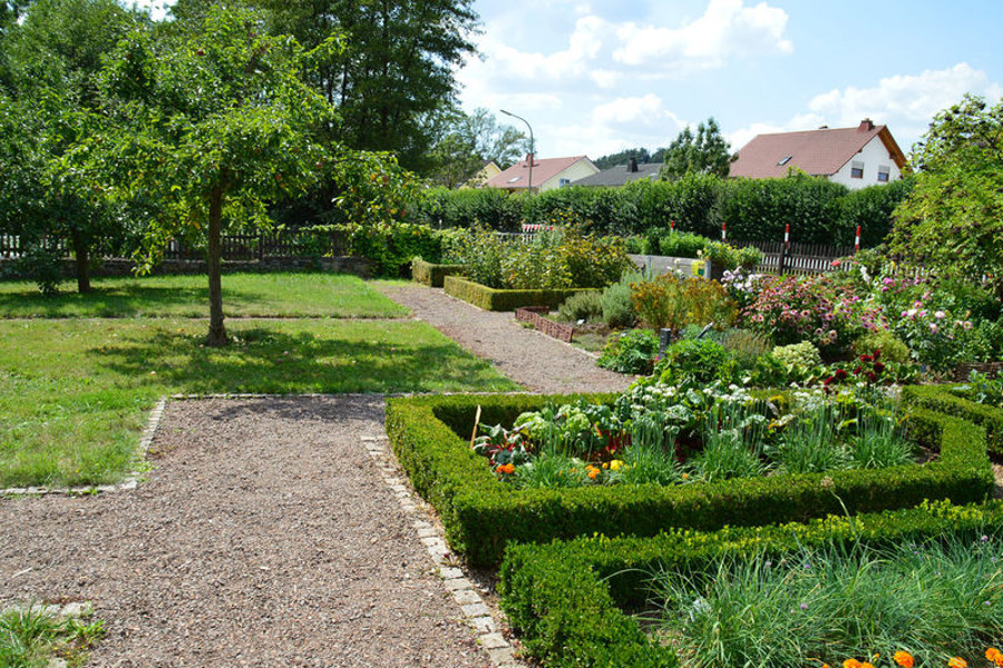 Weiter sind ein Hochbeet, Kompostgefäße, eine Wildbienenwand, Nisthilfen aller Art, ein Schaubienenkasten, Dachbegrünung und Weidegeflechte zur Beetumrandung zu sehen. Seit 2016 ist der Bäuerliche Lehr- und Schaugarten Bestandteil des Gartennetzwerkes "Gärten ohne Grenzen".
